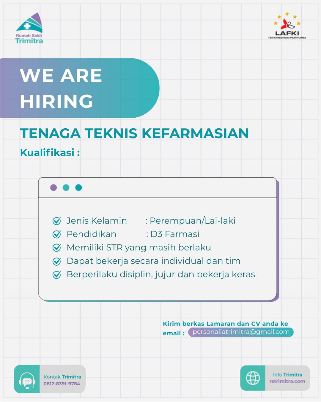 Disclaimer: Farmacare bertindak sebagai platform penyedia informasi dan tidak bertanggung jawab atas isi maupun keakuratan materi lowongan kerja yang dipasang oleh pihak ketiga. Kami mengimbau seluruh pelamar untuk selalu waspada terhadap segala bentuk penipuan yang mengatasnamakan proses rekrutmen. Ingatlah bahwa proses rekrutmen yang resmi tidak pernah memungut biaya apa pun (seperti biaya tiket, akomodasi, atau biaya admin). Selalu lakukan verifikasi mandiri sebelum memberikan data pribadi atau melakukan transaksi.