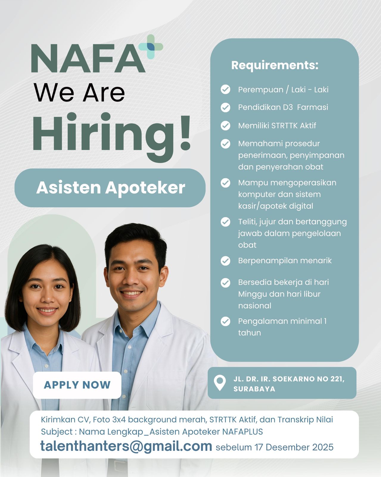 Disclaimer: Farmacare bertindak sebagai platform penyedia informasi dan tidak bertanggung jawab atas isi maupun keakuratan materi lowongan kerja yang dipasang oleh pihak ketiga. Kami mengimbau seluruh pelamar untuk selalu waspada terhadap segala bentuk penipuan yang mengatasnamakan proses rekrutmen. Ingatlah bahwa proses rekrutmen yang resmi tidak pernah memungut biaya apa pun (seperti biaya tiket, akomodasi, atau biaya admin). Selalu lakukan verifikasi mandiri sebelum memberikan data pribadi atau melakukan transaksi.