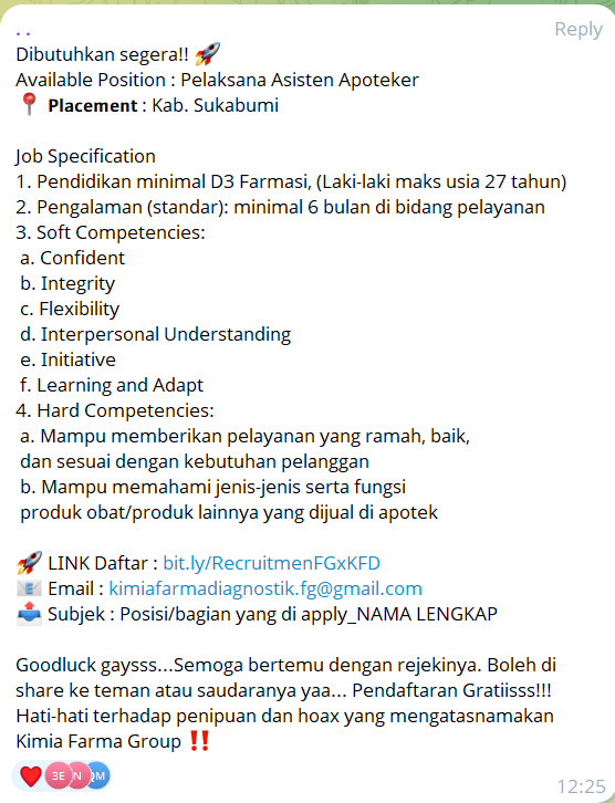 Disclaimer: Farmacare bertindak sebagai platform penyedia informasi dan tidak bertanggung jawab atas isi maupun keakuratan materi lowongan kerja yang dipasang oleh pihak ketiga. Kami mengimbau seluruh pelamar untuk selalu waspada terhadap segala bentuk penipuan yang mengatasnamakan proses rekrutmen. Ingatlah bahwa proses rekrutmen yang resmi tidak pernah memungut biaya apa pun (seperti biaya tiket, akomodasi, atau biaya admin). Selalu lakukan verifikasi mandiri sebelum memberikan data pribadi atau melakukan transaksi.