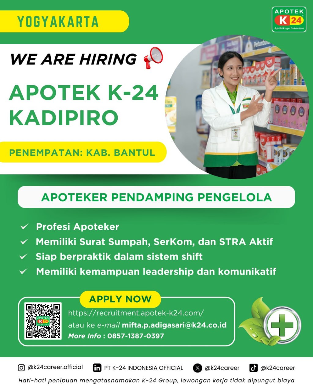 Disclaimer: Farmacare bertindak sebagai platform penyedia informasi dan tidak bertanggung jawab atas isi maupun keakuratan materi lowongan kerja yang dipasang oleh pihak ketiga. Kami mengimbau seluruh pelamar untuk selalu waspada terhadap segala bentuk penipuan yang mengatasnamakan proses rekrutmen. Ingatlah bahwa proses rekrutmen yang resmi tidak pernah memungut biaya apa pun (seperti biaya tiket, akomodasi, atau biaya admin). Selalu lakukan verifikasi mandiri sebelum memberikan data pribadi atau melakukan transaksi.