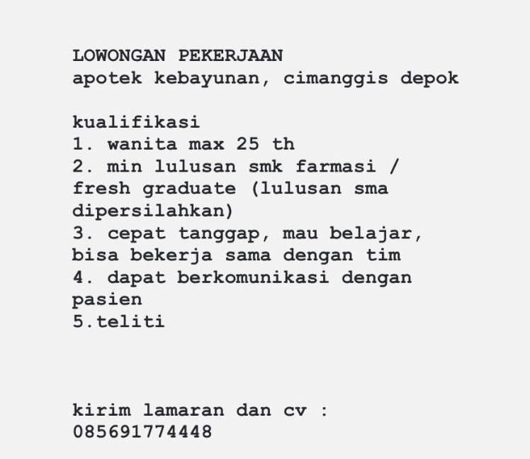 Disclaimer: Farmacare bertindak sebagai platform penyedia informasi dan tidak bertanggung jawab atas isi maupun keakuratan materi lowongan kerja yang dipasang oleh pihak ketiga. Kami mengimbau seluruh pelamar untuk selalu waspada terhadap segala bentuk penipuan yang mengatasnamakan proses rekrutmen. Ingatlah bahwa proses rekrutmen yang resmi tidak pernah memungut biaya apa pun (seperti biaya tiket, akomodasi, atau biaya admin). Selalu lakukan verifikasi mandiri sebelum memberikan data pribadi atau melakukan transaksi.
