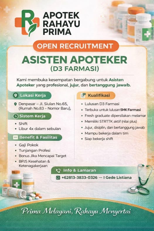 Disclaimer: Farmacare bertindak sebagai platform penyedia informasi dan tidak bertanggung jawab atas isi maupun keakuratan materi lowongan kerja yang dipasang oleh pihak ketiga. Kami mengimbau seluruh pelamar untuk selalu waspada terhadap segala bentuk penipuan yang mengatasnamakan proses rekrutmen. Ingatlah bahwa proses rekrutmen yang resmi tidak pernah memungut biaya apa pun (seperti biaya tiket, akomodasi, atau biaya admin). Selalu lakukan verifikasi mandiri sebelum memberikan data pribadi atau melakukan transaksi.