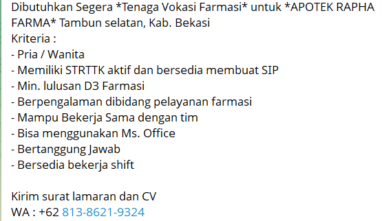 Disclaimer: Farmacare bertindak sebagai platform penyedia informasi dan tidak bertanggung jawab atas isi maupun keakuratan materi lowongan kerja yang dipasang oleh pihak ketiga. Kami mengimbau seluruh pelamar untuk selalu waspada terhadap segala bentuk penipuan yang mengatasnamakan proses rekrutmen. Ingatlah bahwa proses rekrutmen yang resmi tidak pernah memungut biaya apa pun (seperti biaya tiket, akomodasi, atau biaya admin). Selalu lakukan verifikasi mandiri sebelum memberikan data pribadi atau melakukan transaksi.