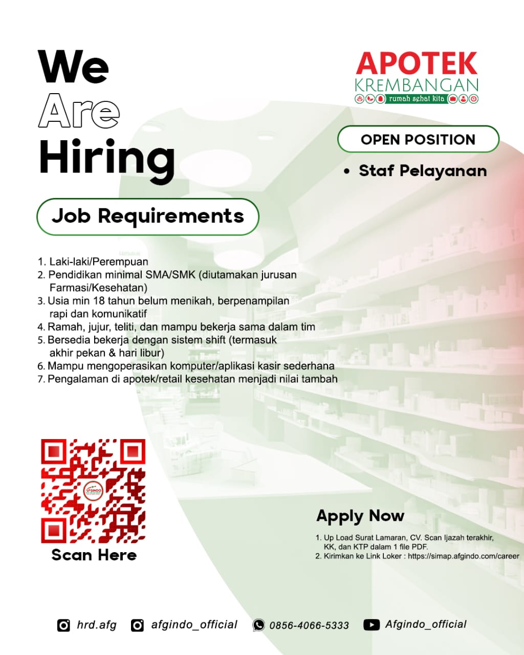 Disclaimer: Farmacare bertindak sebagai platform penyedia informasi dan tidak bertanggung jawab atas isi maupun keakuratan materi lowongan kerja yang dipasang oleh pihak ketiga. Kami mengimbau seluruh pelamar untuk selalu waspada terhadap segala bentuk penipuan yang mengatasnamakan proses rekrutmen. Ingatlah bahwa proses rekrutmen yang resmi tidak pernah memungut biaya apa pun (seperti biaya tiket, akomodasi, atau biaya admin). Selalu lakukan verifikasi mandiri sebelum memberikan data pribadi atau melakukan transaksi.