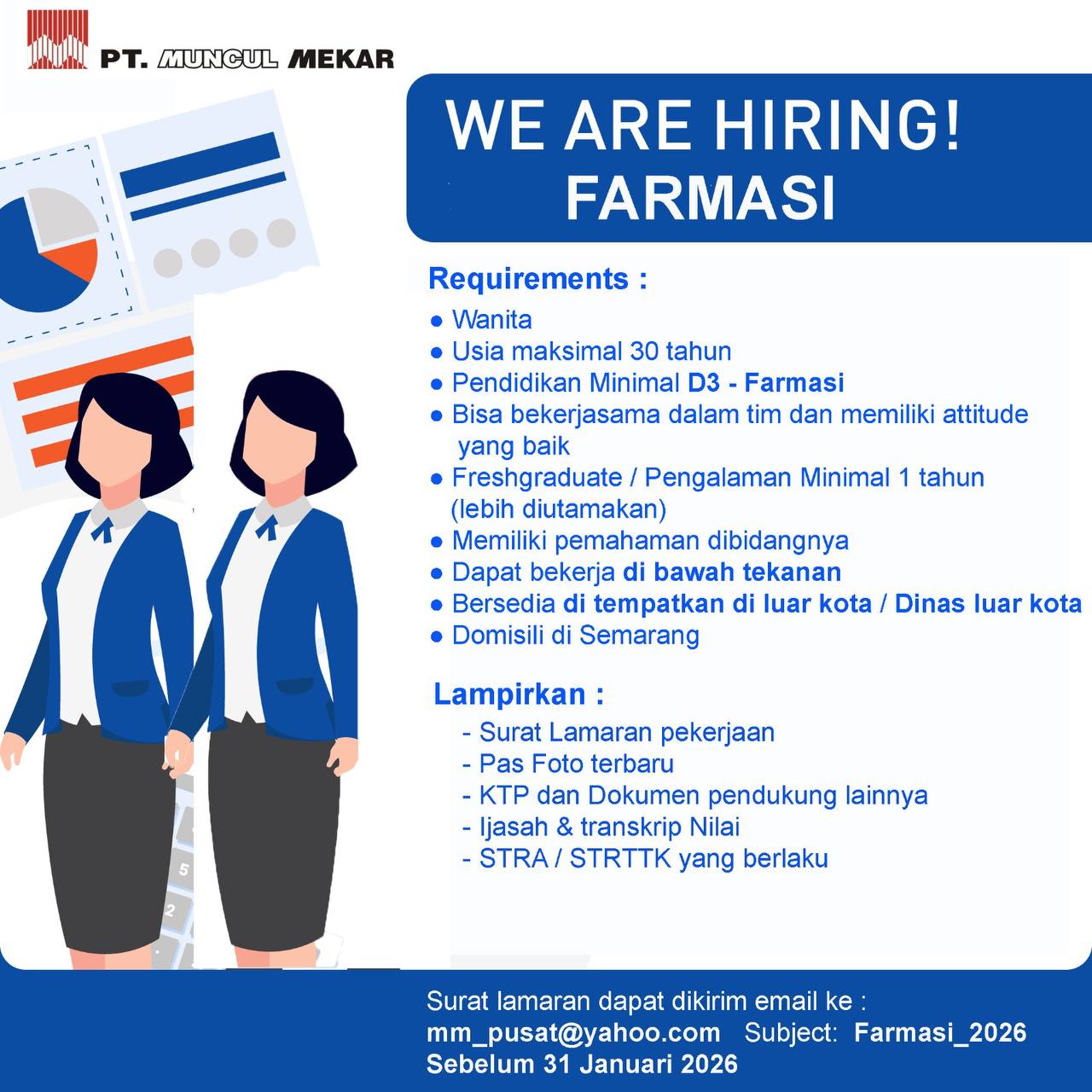 Disclaimer: Farmacare bertindak sebagai platform penyedia informasi dan tidak bertanggung jawab atas isi maupun keakuratan materi lowongan kerja yang dipasang oleh pihak ketiga. Kami mengimbau seluruh pelamar untuk selalu waspada terhadap segala bentuk penipuan yang mengatasnamakan proses rekrutmen. Ingatlah bahwa proses rekrutmen yang resmi tidak pernah memungut biaya apa pun (seperti biaya tiket, akomodasi, atau biaya admin). Selalu lakukan verifikasi mandiri sebelum memberikan data pribadi atau melakukan transaksi.