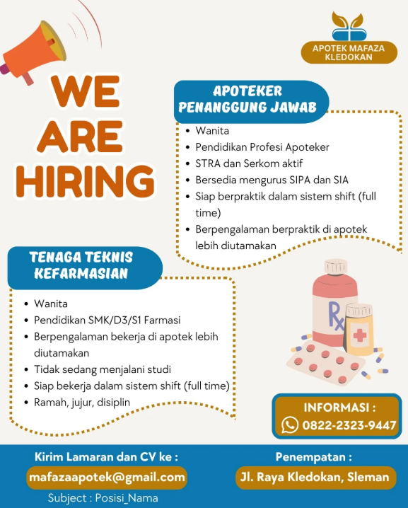 Disclaimer: Farmacare bertindak sebagai platform penyedia informasi dan tidak bertanggung jawab atas isi maupun keakuratan materi lowongan kerja yang dipasang oleh pihak ketiga. Kami mengimbau seluruh pelamar untuk selalu waspada terhadap segala bentuk penipuan yang mengatasnamakan proses rekrutmen. Ingatlah bahwa proses rekrutmen yang resmi tidak pernah memungut biaya apa pun (seperti biaya tiket, akomodasi, atau biaya admin). Selalu lakukan verifikasi mandiri sebelum memberikan data pribadi atau melakukan transaksi.