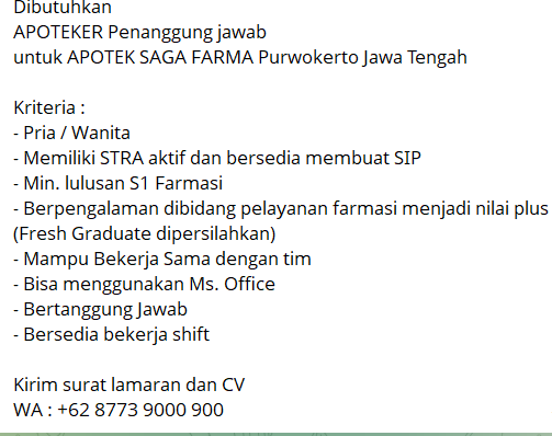Disclaimer: Farmacare bertindak sebagai platform penyedia informasi dan tidak bertanggung jawab atas isi maupun keakuratan materi lowongan kerja yang dipasang oleh pihak ketiga. Kami mengimbau seluruh pelamar untuk selalu waspada terhadap segala bentuk penipuan yang mengatasnamakan proses rekrutmen. Ingatlah bahwa proses rekrutmen yang resmi tidak pernah memungut biaya apa pun (seperti biaya tiket, akomodasi, atau biaya admin). Selalu lakukan verifikasi mandiri sebelum memberikan data pribadi atau melakukan transaksi.