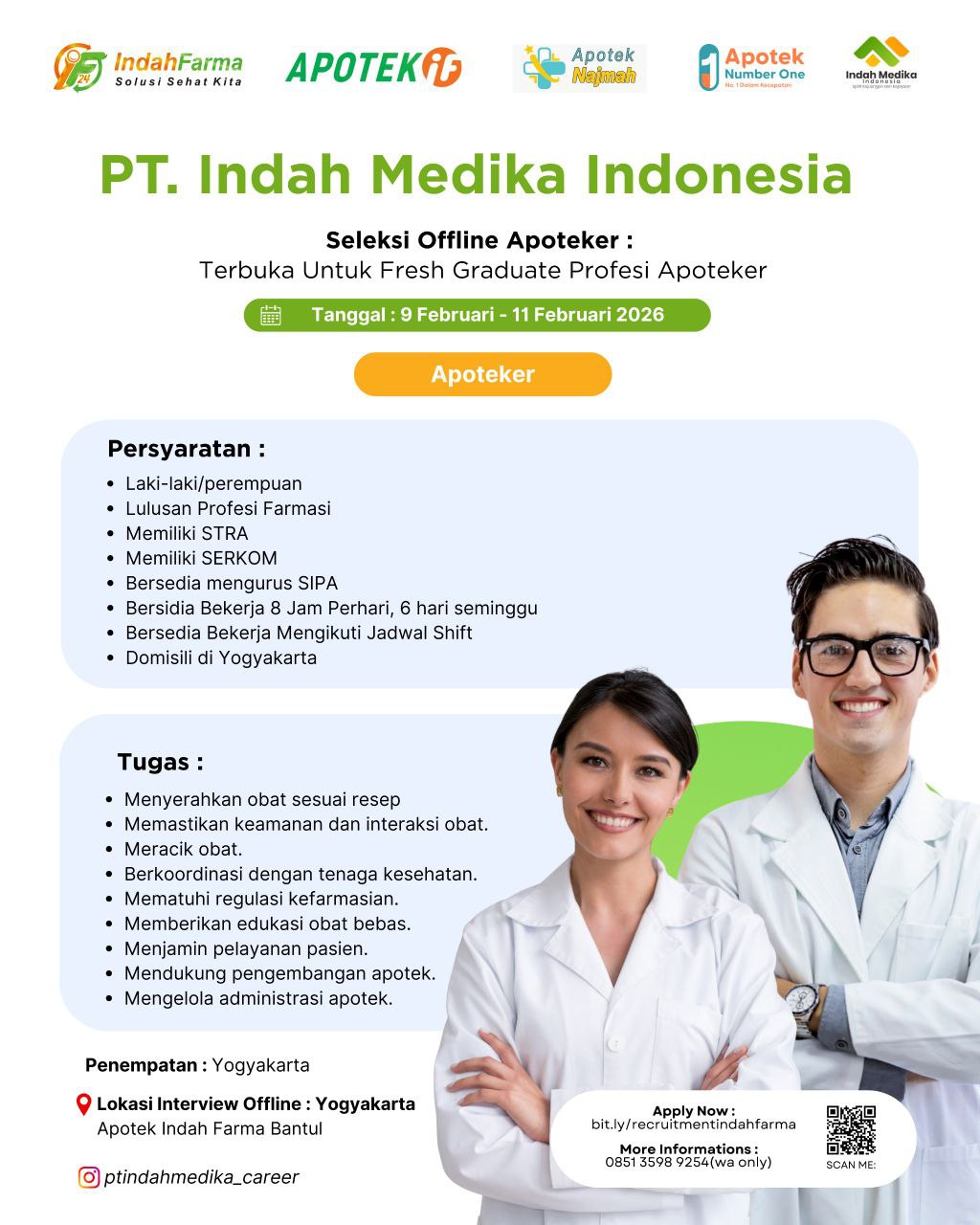 Disclaimer: Farmacare bertindak sebagai platform penyedia informasi dan tidak bertanggung jawab atas isi maupun keakuratan materi lowongan kerja yang dipasang oleh pihak ketiga. Kami mengimbau seluruh pelamar untuk selalu waspada terhadap segala bentuk penipuan yang mengatasnamakan proses rekrutmen. Ingatlah bahwa proses rekrutmen yang resmi tidak pernah memungut biaya apa pun (seperti biaya tiket, akomodasi, atau biaya admin). Selalu lakukan verifikasi mandiri sebelum memberikan data pribadi atau melakukan transaksi.