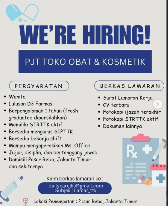 Disclaimer: Farmacare bertindak sebagai platform penyedia informasi dan tidak bertanggung jawab atas isi maupun keakuratan materi lowongan kerja yang dipasang oleh pihak ketiga. Kami mengimbau seluruh pelamar untuk selalu waspada terhadap segala bentuk penipuan yang mengatasnamakan proses rekrutmen. Ingatlah bahwa proses rekrutmen yang resmi tidak pernah memungut biaya apa pun (seperti biaya tiket, akomodasi, atau biaya admin). Selalu lakukan verifikasi mandiri sebelum memberikan data pribadi atau melakukan transaksi.