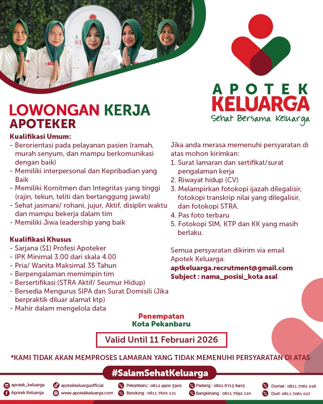 Disclaimer: Farmacare bertindak sebagai platform penyedia informasi dan tidak bertanggung jawab atas isi maupun keakuratan materi lowongan kerja yang dipasang oleh pihak ketiga. Kami mengimbau seluruh pelamar untuk selalu waspada terhadap segala bentuk penipuan yang mengatasnamakan proses rekrutmen. Ingatlah bahwa proses rekrutmen yang resmi tidak pernah memungut biaya apa pun (seperti biaya tiket, akomodasi, atau biaya admin). Selalu lakukan verifikasi mandiri sebelum memberikan data pribadi atau melakukan transaksi.