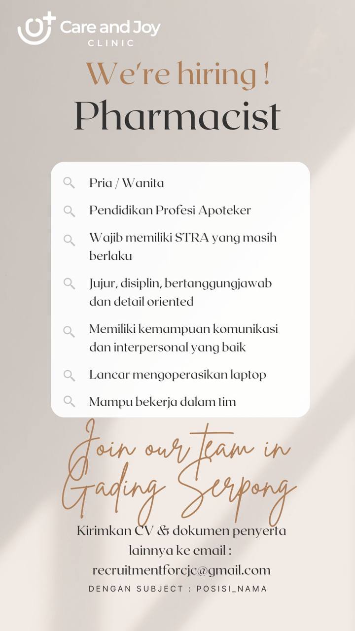 Disclaimer: Farmacare bertindak sebagai platform penyedia informasi dan tidak bertanggung jawab atas isi maupun keakuratan materi lowongan kerja yang dipasang oleh pihak ketiga. Kami mengimbau seluruh pelamar untuk selalu waspada terhadap segala bentuk penipuan yang mengatasnamakan proses rekrutmen. Ingatlah bahwa proses rekrutmen yang resmi tidak pernah memungut biaya apa pun (seperti biaya tiket, akomodasi, atau biaya admin). Selalu lakukan verifikasi mandiri sebelum memberikan data pribadi atau melakukan transaksi.