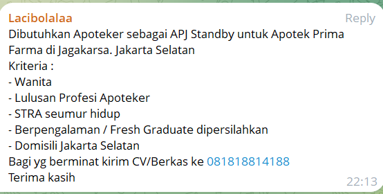 Disclaimer: Farmacare bertindak sebagai platform penyedia informasi dan tidak bertanggung jawab atas isi maupun keakuratan materi lowongan kerja yang dipasang oleh pihak ketiga. Kami mengimbau seluruh pelamar untuk selalu waspada terhadap segala bentuk penipuan yang mengatasnamakan proses rekrutmen. Ingatlah bahwa proses rekrutmen yang resmi tidak pernah memungut biaya apa pun (seperti biaya tiket, akomodasi, atau biaya admin). Selalu lakukan verifikasi mandiri sebelum memberikan data pribadi atau melakukan transaksi.