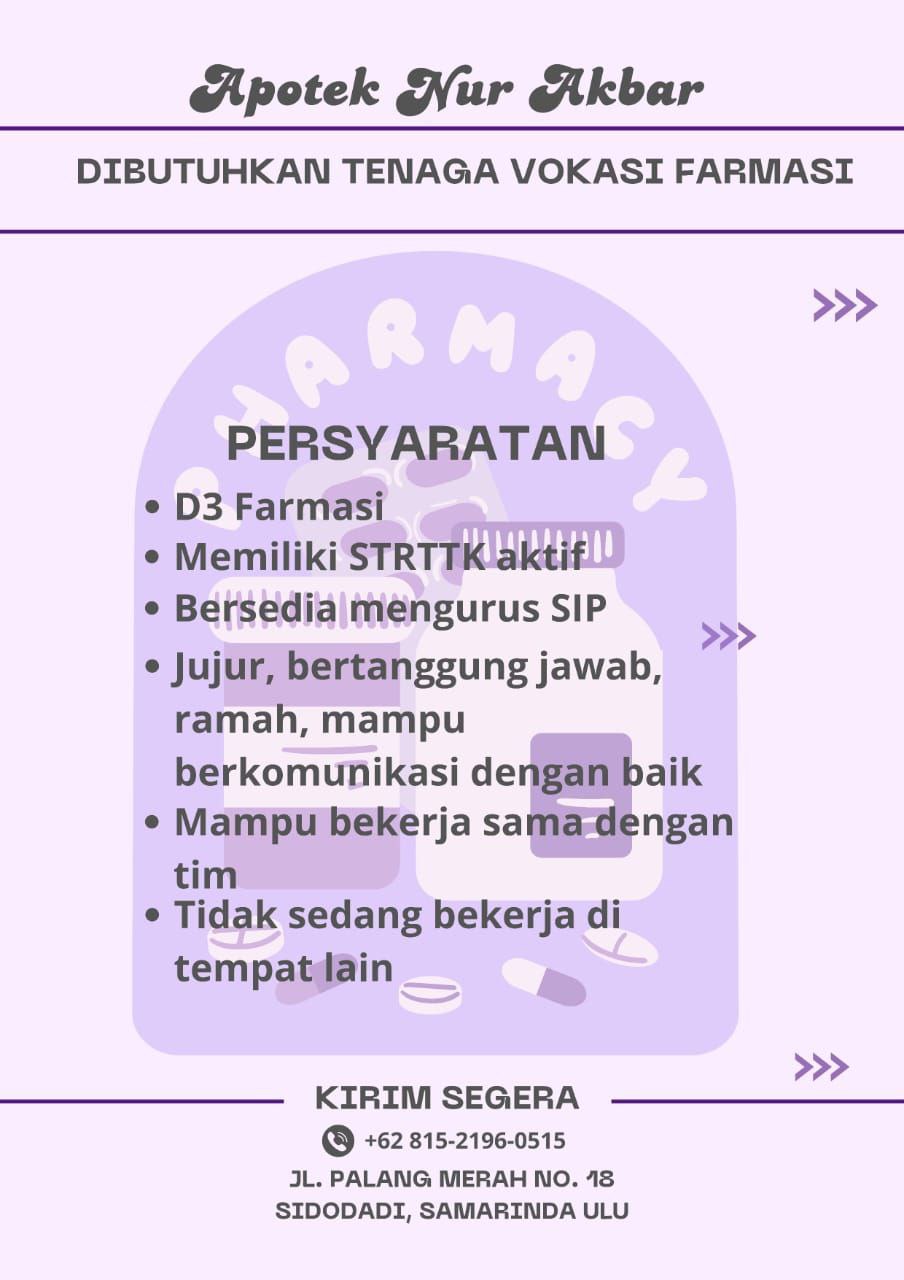 Disclaimer: Farmacare bertindak sebagai platform penyedia informasi dan tidak bertanggung jawab atas isi maupun keakuratan materi lowongan kerja yang dipasang oleh pihak ketiga. Kami mengimbau seluruh pelamar untuk selalu waspada terhadap segala bentuk penipuan yang mengatasnamakan proses rekrutmen. Ingatlah bahwa proses rekrutmen yang resmi tidak pernah memungut biaya apa pun (seperti biaya tiket, akomodasi, atau biaya admin). Selalu lakukan verifikasi mandiri sebelum memberikan data pribadi atau melakukan transaksi.