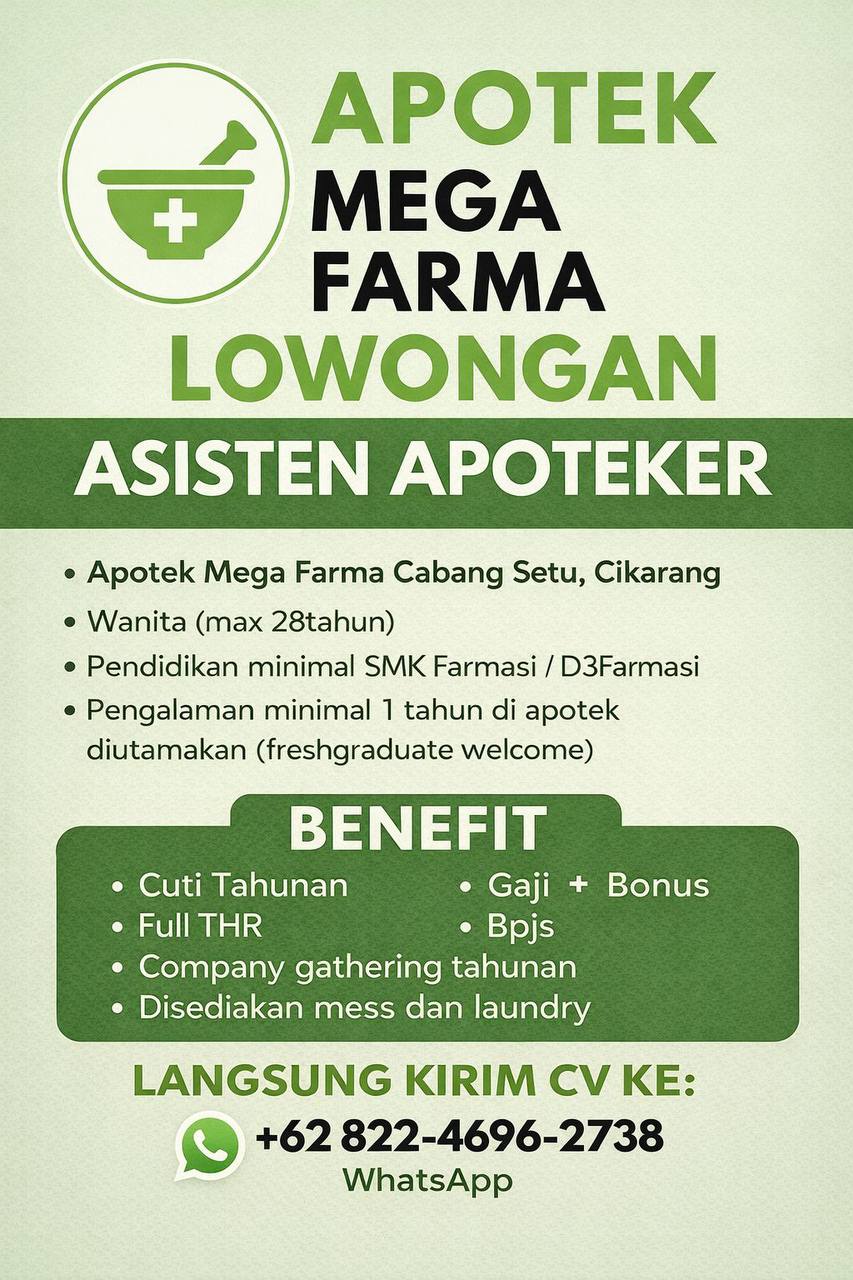Disclaimer: Farmacare bertindak sebagai platform penyedia informasi dan tidak bertanggung jawab atas isi maupun keakuratan materi lowongan kerja yang dipasang oleh pihak ketiga. Kami mengimbau seluruh pelamar untuk selalu waspada terhadap segala bentuk penipuan yang mengatasnamakan proses rekrutmen. Ingatlah bahwa proses rekrutmen yang resmi tidak pernah memungut biaya apa pun (seperti biaya tiket, akomodasi, atau biaya admin). Selalu lakukan verifikasi mandiri sebelum memberikan data pribadi atau melakukan transaksi.