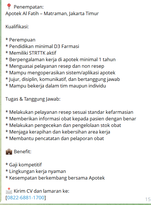 Disclaimer: Farmacare bertindak sebagai platform penyedia informasi dan tidak bertanggung jawab atas isi maupun keakuratan materi lowongan kerja yang dipasang oleh pihak ketiga. Kami mengimbau seluruh pelamar untuk selalu waspada terhadap segala bentuk penipuan yang mengatasnamakan proses rekrutmen. Ingatlah bahwa proses rekrutmen yang resmi tidak pernah memungut biaya apa pun (seperti biaya tiket, akomodasi, atau biaya admin). Selalu lakukan verifikasi mandiri sebelum memberikan data pribadi atau melakukan transaksi.