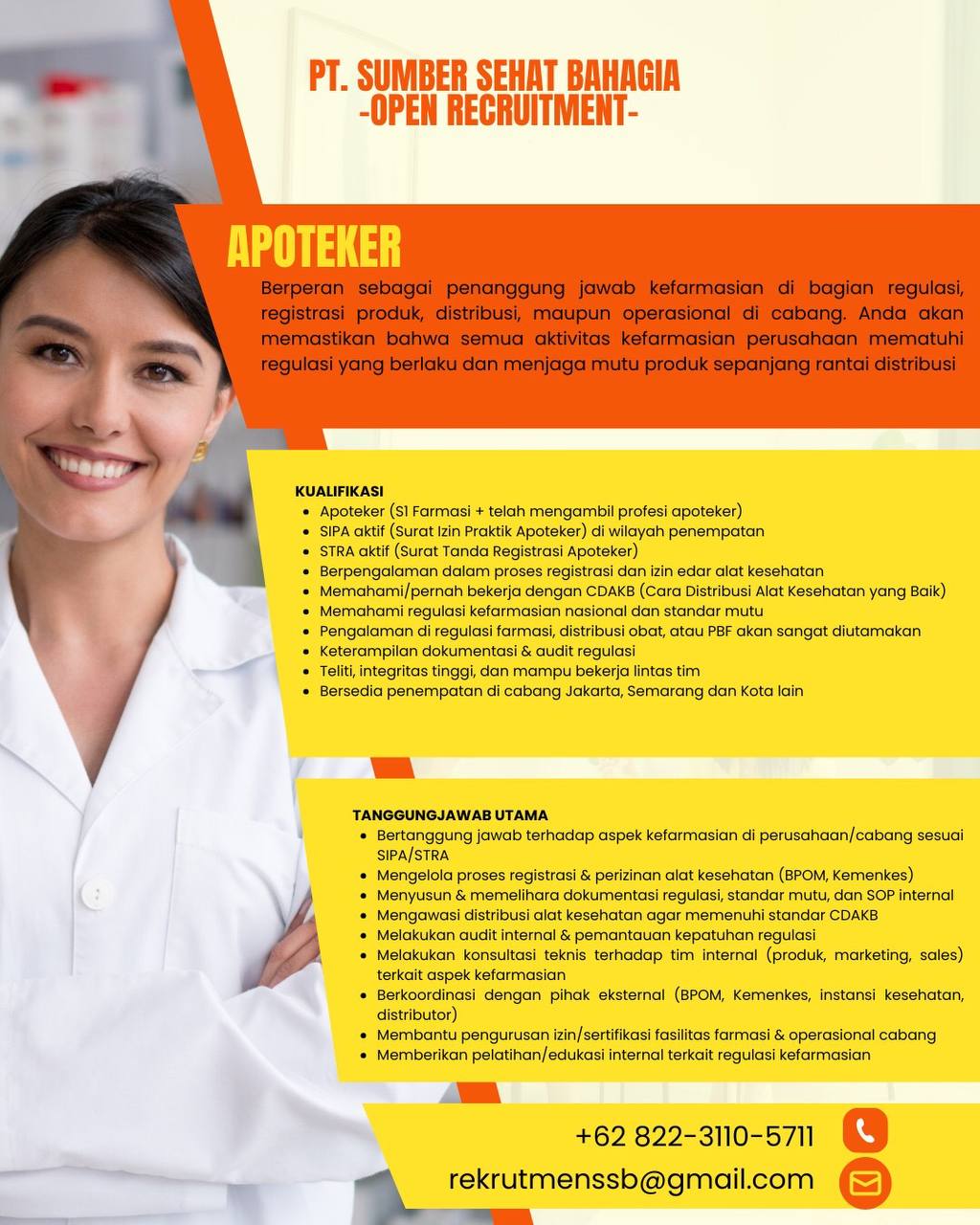 Disclaimer: Farmacare bertindak sebagai platform penyedia informasi dan tidak bertanggung jawab atas isi maupun keakuratan materi lowongan kerja yang dipasang oleh pihak ketiga. Kami mengimbau seluruh pelamar untuk selalu waspada terhadap segala bentuk penipuan yang mengatasnamakan proses rekrutmen. Ingatlah bahwa proses rekrutmen yang resmi tidak pernah memungut biaya apa pun (seperti biaya tiket, akomodasi, atau biaya admin). Selalu lakukan verifikasi mandiri sebelum memberikan data pribadi atau melakukan transaksi.