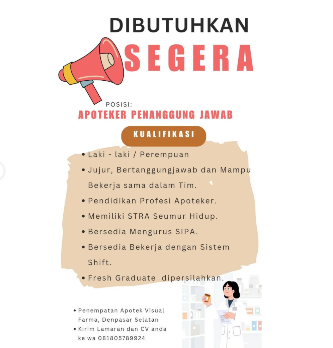 Disclaimer: Farmacare bertindak sebagai platform penyedia informasi dan tidak bertanggung jawab atas isi maupun keakuratan materi lowongan kerja yang dipasang oleh pihak ketiga. Kami mengimbau seluruh pelamar untuk selalu waspada terhadap segala bentuk penipuan yang mengatasnamakan proses rekrutmen. Ingatlah bahwa proses rekrutmen yang resmi tidak pernah memungut biaya apa pun (seperti biaya tiket, akomodasi, atau biaya admin). Selalu lakukan verifikasi mandiri sebelum memberikan data pribadi atau melakukan transaksi.
