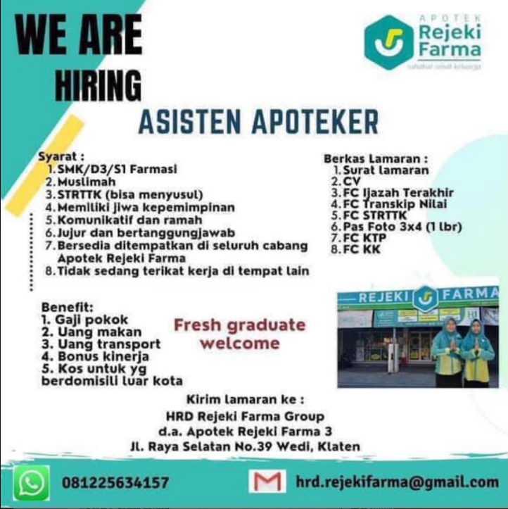 Disclaimer: Farmacare bertindak sebagai platform penyedia informasi dan tidak bertanggung jawab atas isi maupun keakuratan materi lowongan kerja yang dipasang oleh pihak ketiga. Kami mengimbau seluruh pelamar untuk selalu waspada terhadap segala bentuk penipuan yang mengatasnamakan proses rekrutmen. Ingatlah bahwa proses rekrutmen yang resmi tidak pernah memungut biaya apa pun (seperti biaya tiket, akomodasi, atau biaya admin). Selalu lakukan verifikasi mandiri sebelum memberikan data pribadi atau melakukan transaksi.