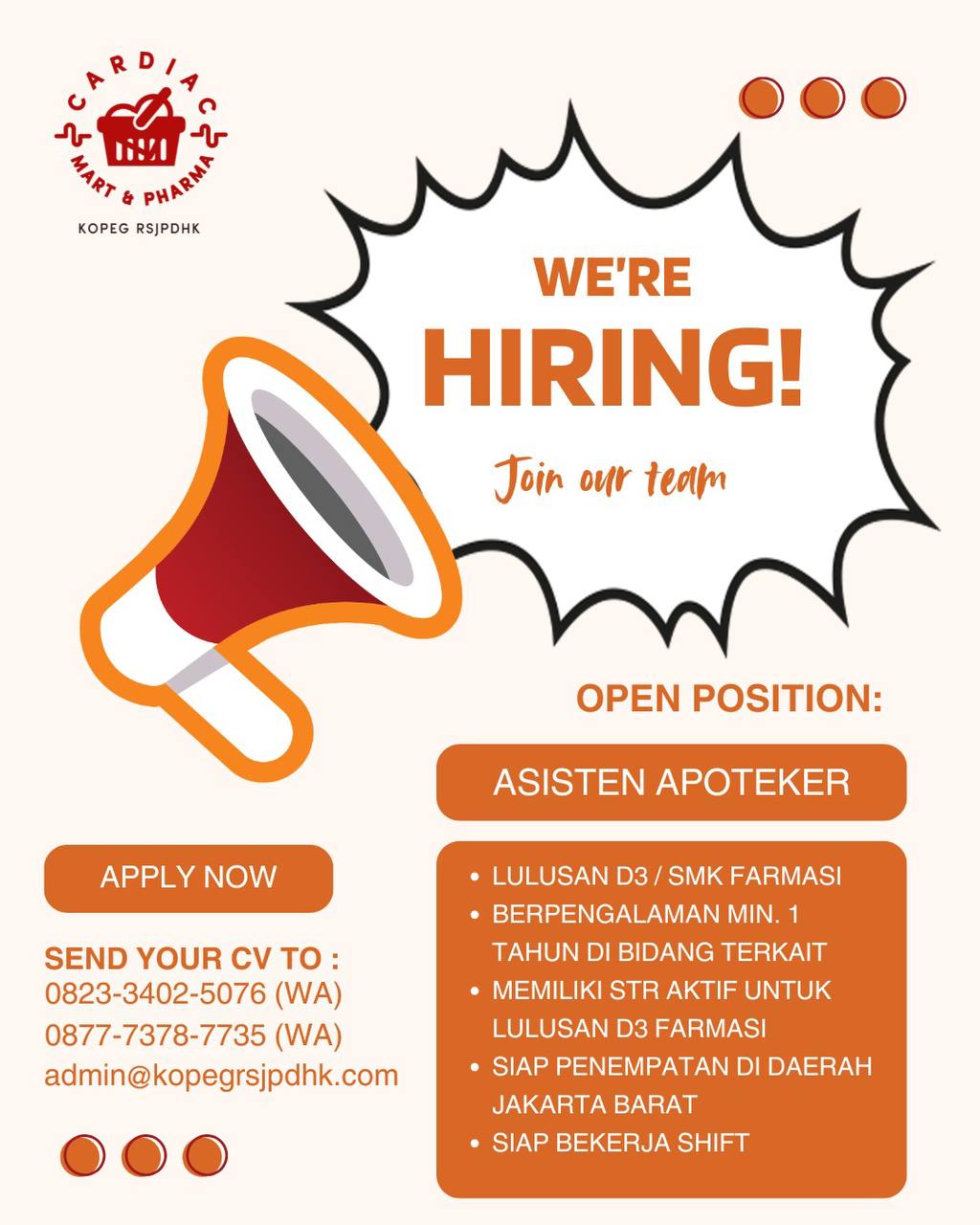Disclaimer: Farmacare bertindak sebagai platform penyedia informasi dan tidak bertanggung jawab atas isi maupun keakuratan materi lowongan kerja yang dipasang oleh pihak ketiga. Kami mengimbau seluruh pelamar untuk selalu waspada terhadap segala bentuk penipuan yang mengatasnamakan proses rekrutmen. Ingatlah bahwa proses rekrutmen yang resmi tidak pernah memungut biaya apa pun (seperti biaya tiket, akomodasi, atau biaya admin). Selalu lakukan verifikasi mandiri sebelum memberikan data pribadi atau melakukan transaksi.