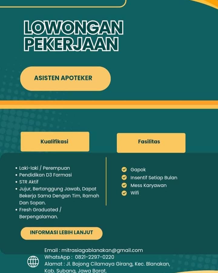 Disclaimer: Farmacare bertindak sebagai platform penyedia informasi dan tidak bertanggung jawab atas isi maupun keakuratan materi lowongan kerja yang dipasang oleh pihak ketiga. Kami mengimbau seluruh pelamar untuk selalu waspada terhadap segala bentuk penipuan yang mengatasnamakan proses rekrutmen. Ingatlah bahwa proses rekrutmen yang resmi tidak pernah memungut biaya apa pun (seperti biaya tiket, akomodasi, atau biaya admin). Selalu lakukan verifikasi mandiri sebelum memberikan data pribadi atau melakukan transaksi.