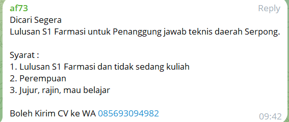 Disclaimer: Farmacare bertindak sebagai platform penyedia informasi dan tidak bertanggung jawab atas isi maupun keakuratan materi lowongan kerja yang dipasang oleh pihak ketiga. Kami mengimbau seluruh pelamar untuk selalu waspada terhadap segala bentuk penipuan yang mengatasnamakan proses rekrutmen. Ingatlah bahwa proses rekrutmen yang resmi tidak pernah memungut biaya apa pun (seperti biaya tiket, akomodasi, atau biaya admin). Selalu lakukan verifikasi mandiri sebelum memberikan data pribadi atau melakukan transaksi.