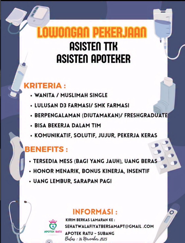 Disclaimer: Farmacare bertindak sebagai platform penyedia informasi dan tidak bertanggung jawab atas isi maupun keakuratan materi lowongan kerja yang dipasang oleh pihak ketiga. Kami mengimbau seluruh pelamar untuk selalu waspada terhadap segala bentuk penipuan yang mengatasnamakan proses rekrutmen. Ingatlah bahwa proses rekrutmen yang resmi tidak pernah memungut biaya apa pun (seperti biaya tiket, akomodasi, atau biaya admin). Selalu lakukan verifikasi mandiri sebelum memberikan data pribadi atau melakukan transaksi.