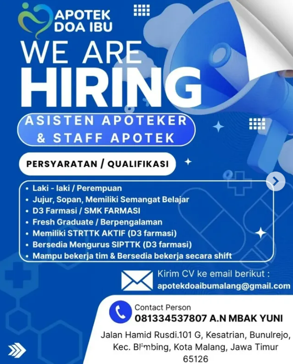 Disclaimer: Farmacare bertindak sebagai platform penyedia informasi dan tidak bertanggung jawab atas isi maupun keakuratan materi lowongan kerja yang dipasang oleh pihak ketiga. Kami mengimbau seluruh pelamar untuk selalu waspada terhadap segala bentuk penipuan yang mengatasnamakan proses rekrutmen. Ingatlah bahwa proses rekrutmen yang resmi tidak pernah memungut biaya apa pun (seperti biaya tiket, akomodasi, atau biaya admin). Selalu lakukan verifikasi mandiri sebelum memberikan data pribadi atau melakukan transaksi.